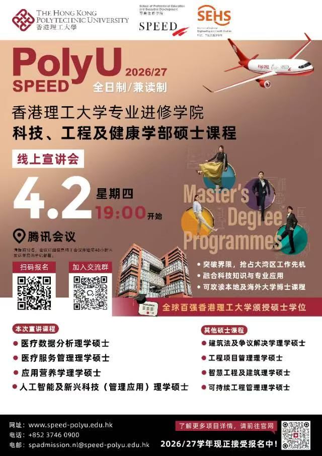 香港理工大学 SPEED 学院26Fall入学线上宣讲会重磅来袭! 把握风口上岸!